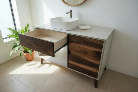 Concrete and Hard Wood Custom Bathroom Vanity with Wood Top and Drawers