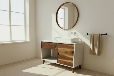 Meuble-lavabo de salle de bain personnalisable, tiroirs en béton et noyer massif